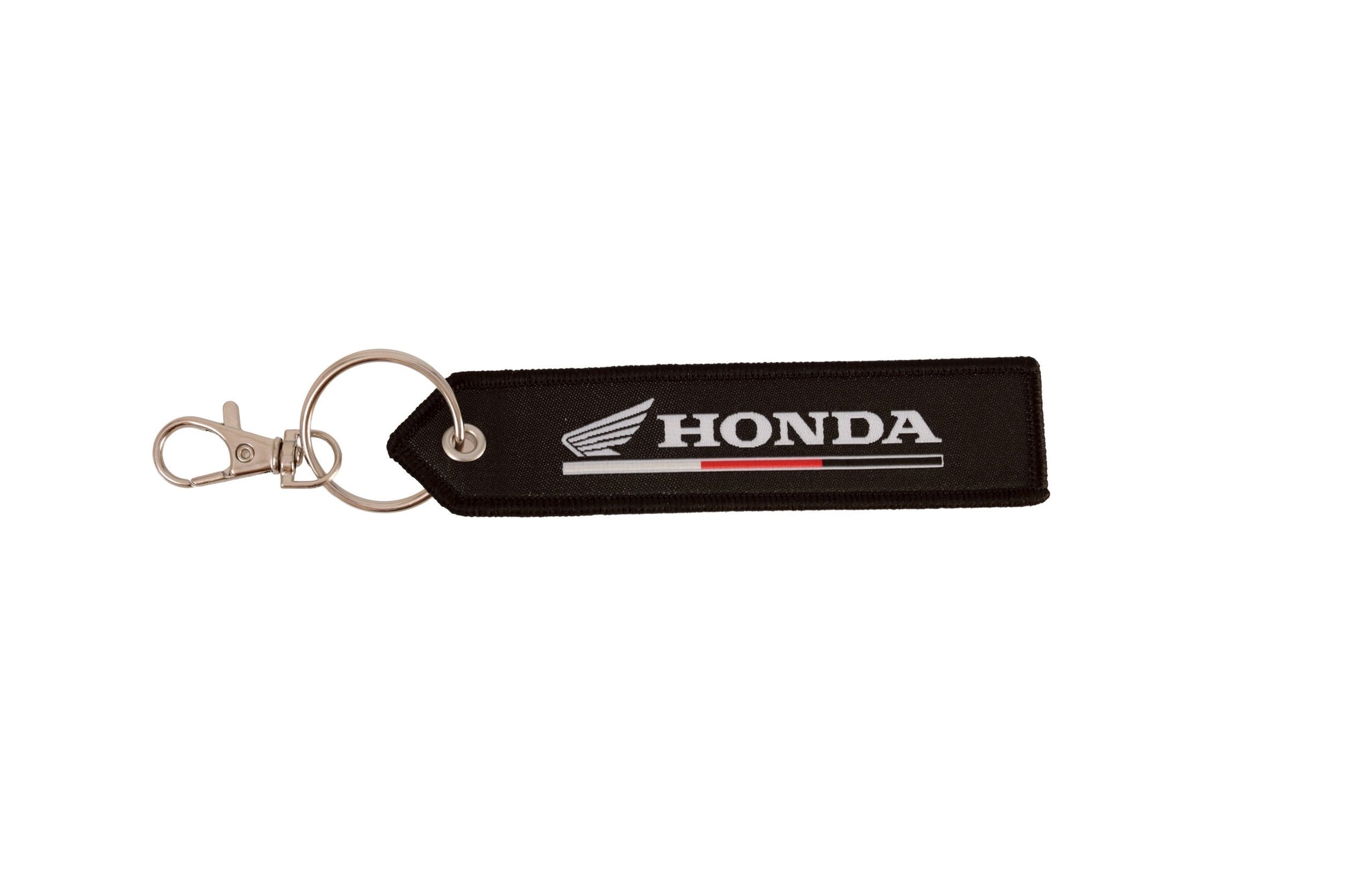 背景は二輪車のスピード感をイメージ。各車体カラーに合わせてパッと目を惹くデザインに仕上げました。裏面はブラックをベースに、ロゴ下ラインでは車体カラーとリンクさせてみました。回転カンの金具付きで、着脱も簡単にご使用いただけます。